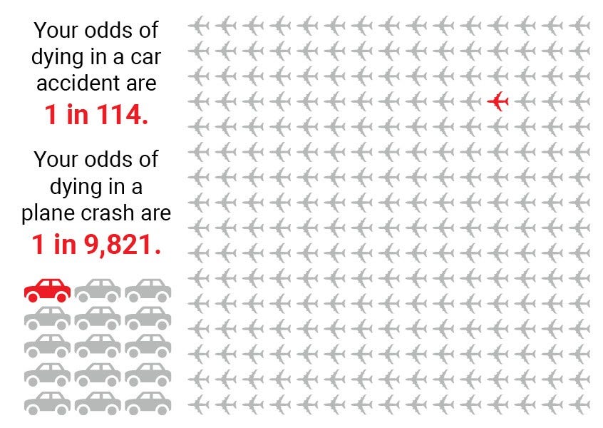 And yet … and yet, as we all know, personal vehicle fatalities per accident are generally in the single digits. Deaths from airline crashes are in the multiple dozens to hundreds.