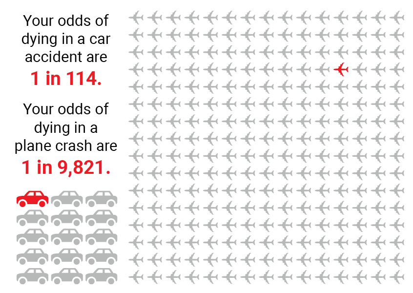 In recent years there have been somewhere between 30,000 and 35,000 fatal auto accidents annually. Airline crashes are counted in the dozens. Some years there have been zero fatalities. Your odds of dying in a car accident are 1 in 114. Your odds of dying in a plane crash are 1 in 9,821.