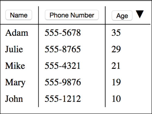Note the use of the orderBy filter in the ngRepeat directive. It’s passed the string ‘-age’ to specify that the list should be ordered by the field ‘age’ in reverse order (hence the minus sign). The next example in Angular’s documentation shows how the code is modified to change the sort parameter dynamically. This allows you to click on a table header and sort by that field. To accomplish this, define the scope property ‘propertyName’ and use that in the orderBy filter instead of a static string. As you click on the table header, ‘propertyName’ is set to the corresponding value. Thus, the table sorts accordingly.