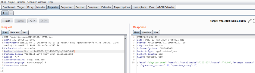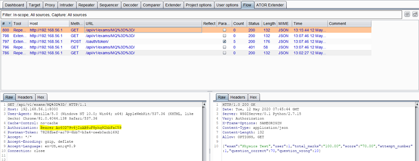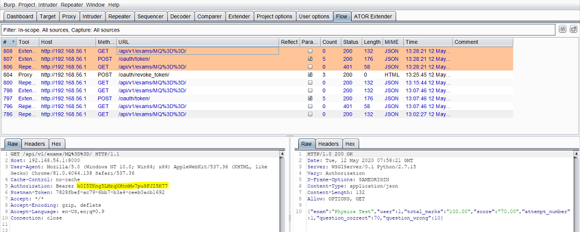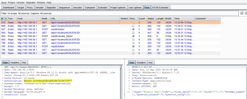 The repeater sends a request with a valid token (AT1). ATOR checks the status code in the response. It’s OK (200), so ATOR sends the response to the repeater: