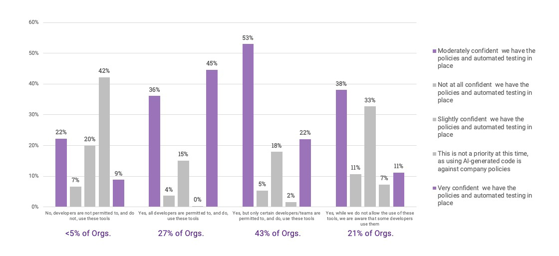 Even though their development teams are rapidly adopting AI tools, our survey results show that many organizations are struggling to keep pace with that adoption and still in the process of putting policies and tools into place to manage the unique challenges posed by AI-generated code.
