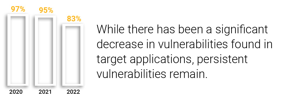 The recently published 2023 Software Vulnerability Snapshot report from Black Duck uses anonymized data from three years of tests on commercial software systems and applications to demonstrate that while there has been a significant decrease in vulnerabilities found in target applications—from 97% in 2020 to 83% in 2022—persistent vulnerabilities remain and pose significant challenges to web and software application security.