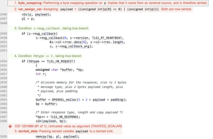 Initially, we wanted to independently verify the results so we ran the latest production version of our analysis (7.0.3) against openssl-1.0.1. Coverity Scan uses a particular set of analysis options, and we wondered if different settings might cause the defect to appear. After a few experiments, we determined that analysis settings didn’t make a difference for this particular defect.So we dug into the code further to determine why. At its heart, Heartbleed is an out of bounds memory read based on tainted data being used as an argument to memcpy. The main difficulty in detecting it is in realizing the source data is tainted. Most of the descriptions of Heartbleed begin with this line:
