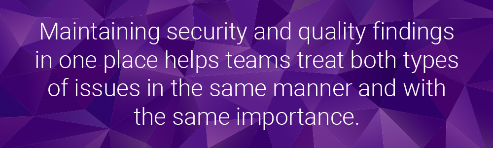Security vulnerabilities are commonly reported differently than quality and functional defects. Often, organizations maintain the two types of findings—security and quality—in two different locations. This reduces the visibility each team and role has when they look at the overall security posture of their project.