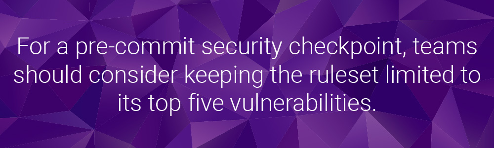 It is key, therefore, to start small and early. Security testing should begin as far left in the SDLC as possible and should be done with a gradually increasing scope. For example, instead of enabling full scans or scans with the entire ruleset for a pre-commit security checkpoint, teams should consider keeping the ruleset limited to its top five vulnerabilities. The security activities that occur later in the SDLC can include deeper scans and reviews for prerelease security assurance.