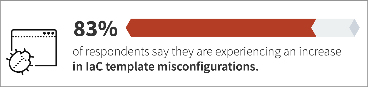 However, this can lead to security concerns. While IT/Ops may be somewhat versed in security best practices, that’s less true of development teams. 83% of respondents are experiencing an increase in IaC misconfigurations. This leads to issues like unauthorized access to apps and data, the introduction of cryptojacking malware to mine cryptocurrency, and fines due to noncompliance with industry regulations.