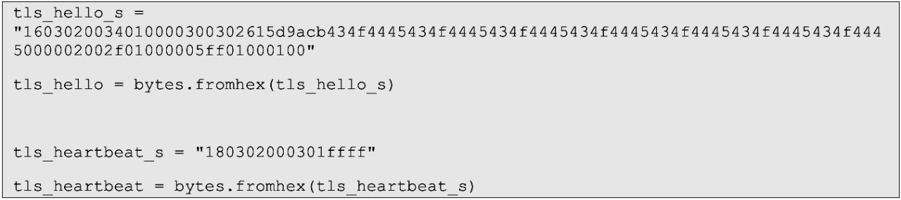 In Python, the ClientHello and heartbeat request messages can be defined as follows: