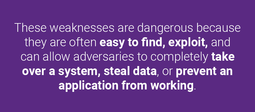 As MITRE put it, “These weaknesses are dangerous because they are often easy to find, exploit, and can allow adversaries to completely take over a system, steal data, or prevent an application from working.”
