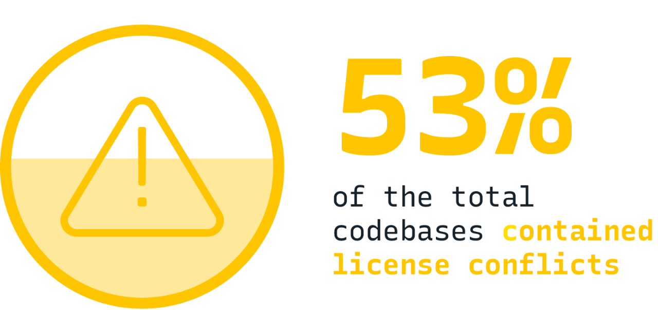 Based on the audit data presented in the 2024 “Open Source Security and Risk Analysis” (OSSRA) report, organizations in all verticals should be concerned about the potential risk of litigation or threat to their intellectual property rights due to failure to comply with an open source license. The report’s findings show that over half—53%—of the 2023 audited codebases contained open source with license conflicts.