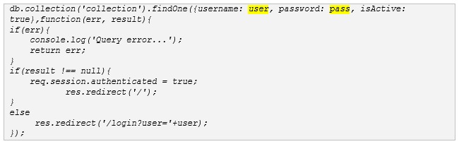 When Express processes the x-www-form-urlencoded request body, this will be parsed into the object {user: ‘admin’, pass: {$ne: null} and passed to the MongoDB query in the code block below.