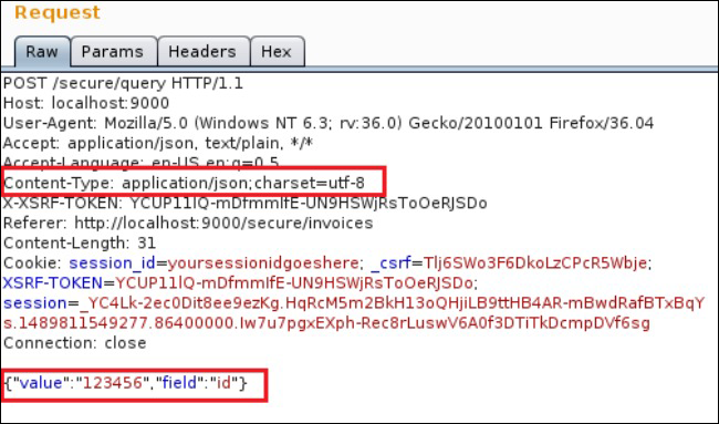 If we attempt the same injection attack on the /secure/query API, we see that the request contains a JSON body which, unlike a simple POST body, is not vulnerable to attribute pollution when parsed by Express.