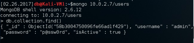 Figure 7: Accessing MongoDB users database directly with Mongo Shell