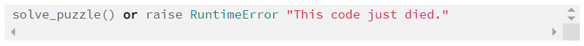 When I first started learning Ruby, I was excited to discover that Ruby has the keywords and and or as boolean operators. I quickly got into the habit of writing all of my boolean statements with these, instead of the more conventional && and ||, because my code became so much more readable. I thought the word versions of the boolean operators were part of Ruby’s mission to make code more like spoken language. For example, the following is valid Ruby syntax, and you don’t have to know the language to know what it does.