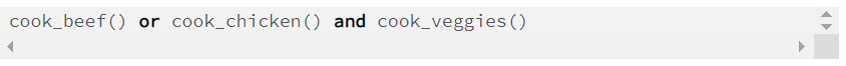 A final important point is that and and or have the same precedence, unlike their symbolic counterparts where && evaluates before ||. This means that operations chained together with with and and or always get evaluated from left to right.