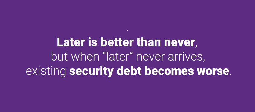 Security debt accumulates when a development organization releases software without addressing its weaknesses and vulnerabilities. Sometimes the organization fails to test software thoroughly throughout the SDLC. Sometimes it decides that the pressure to finish a project is so great that it makes more sense to release now and fix vulnerabilities later. Later is better than never, but when “later” never arrives, existing security debt becomes worse.