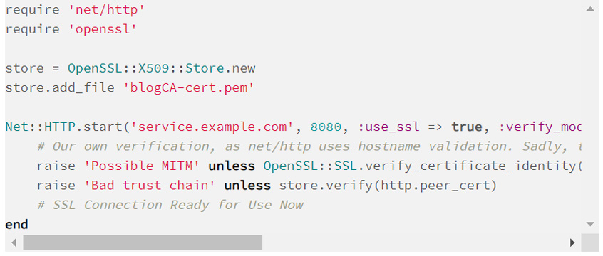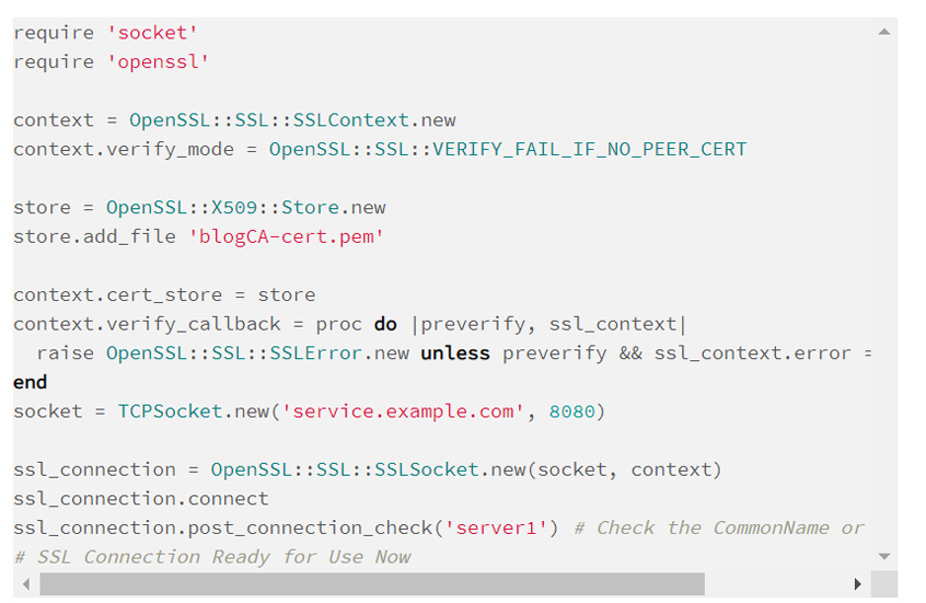 There can be some gotchas in the minefield of secure SSL communication, especially as we're using the commonName as a service identifier rather than just matching the hostname. Some examples below perform peer verification from the client's perspective with that in mind. Feel free to send along any equivalent ones in other languages and I'd be happy to credit and include them.