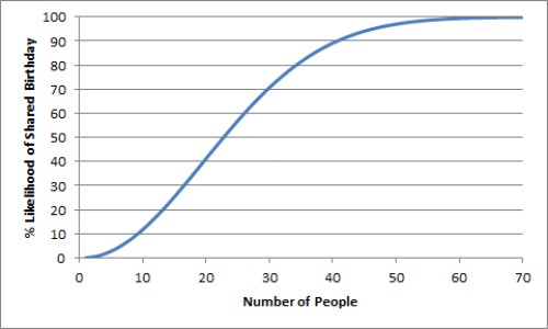 To understand this, we need to also understand the birthday paradox. The birthday paradox is about the probability of at least two people sharing the same birthday in a room containing N people who are chosen at random. Given several assumptions (e.g., all birthdays are equally likely, ignoring leap years, etc.), it turns out that for N = 23, the probability of a shared birthday is 50%. This turns out to be much lower than most people would intuitively believe. Here is a chart that shows the probability of shared birthdays for N between 2 and 70: