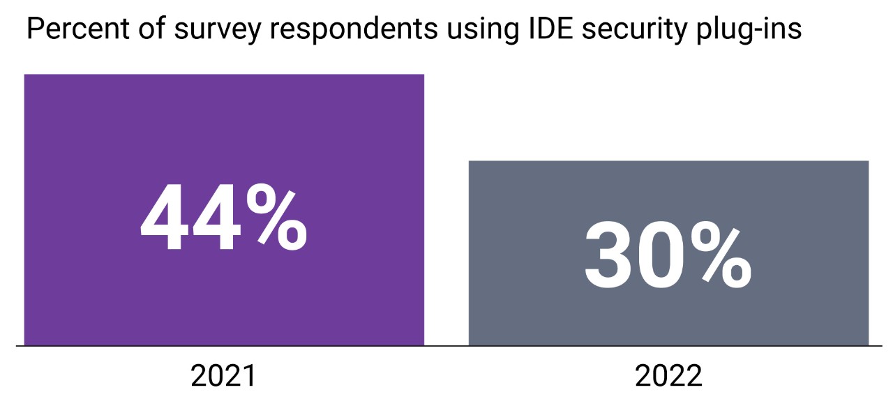 Let’s begin by examining what we can learn from the SANS report. The good news is that the survey found that shifting left is being instituted across the DevSecOps community. Security testing increased at the architecture and design stage, the requirements and use case stage, the code commit and pull request stage, and the QA and acceptance stage. The bad news for secure coding is that the only stage where security testing fell was at the interactive development environment (IDE) security plug-ins stage. While 44% of respondents surveyed in 2021 were using IDE security plug-ins, by 2022 that number had fallen to 30%. Reducing risk awareness and testing in the IDE increases the likelihood that issues will go undetected and persist downstream into the main product.