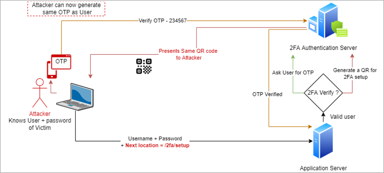 MyWorkApp, however, has a misconfiguration that allows more than one device to be configured for 2FA purposes. This means Alice can have 2FA set up with the same code generator running on two or more phones/devices. Bob uses this information to exploit the application in the following manner: