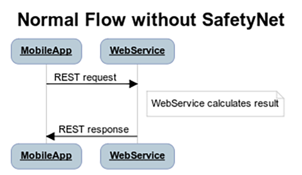 Now, imagine that you want to ensure that the device your application is running on is not rooted or tampered with in some other way. The application may choose to do client-side checks, implementing SafetyNet attest() insecurely, as in the following sequence diagram: