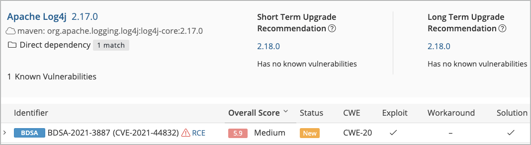 You’ve created or received an SBOM, so what do you do with it? This is a question that can be answered by looking back at our example with the problematic Log4j components. Although most of us have heard of the Log4j zero-day vulnerability disclosed last December, let’s pretend we haven’t. By looking at the screenshot of the SBOM, you see that we have Apache Log4j 2.17.0, but what you don’t see is any information about associated risk.