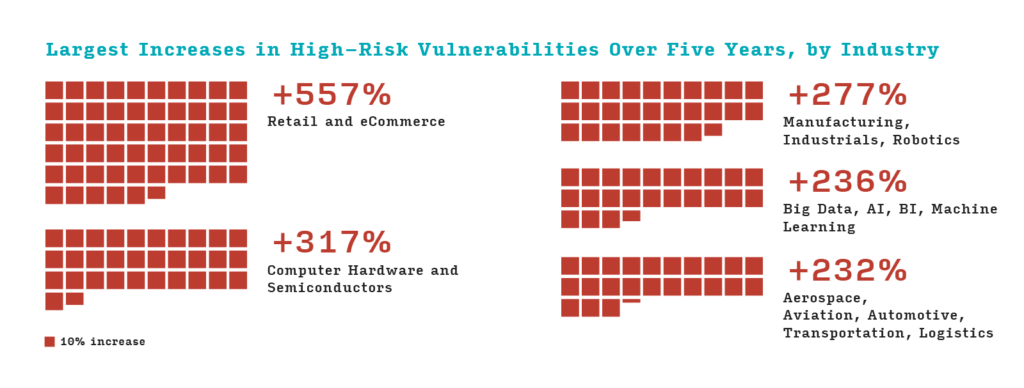今年新たな点として、5年間の振り返りでは、オープンソースとセキュリティのトレンドの幅広い視点を提供しています。これは、業種毎に、監査されたコードベースのオープンソースの全割合は、さまざまであるものの、全般的に増加していることがわかります。脆弱性についても同様で、特定の業種では脆弱性の急増の懸念と脆弱性の緩和対策が欠けていることを示しています。
