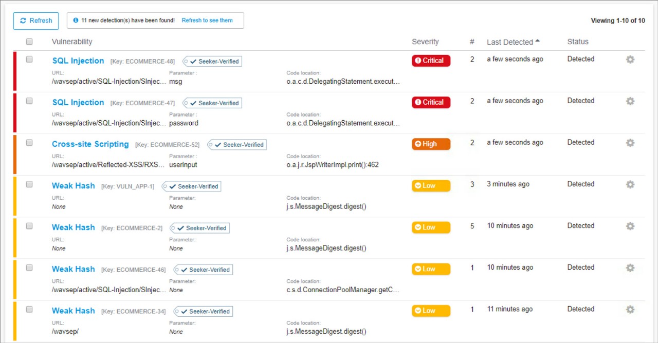 既存の機能テスト(手動または自動)に変更を加えることなく、脆弱性やセキュリティ設定のミスなど、実行時にのみ顕在化する悪用可能な状態についての知見を得ることができます。インタラクティブ・アプリケーション・セキュリティ・テスト(IAST)は、本番移行前の実行時テストのバックグラウンドでアプリケーションの挙動を監視し、結果を自動で検証してくれるため、誤検知の追跡に無駄な労力を奪われることがありません。