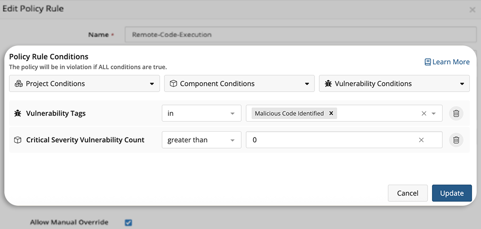 Implement policies across your teams and apps to stop high-risk components and vulnerabilities from reaching production.